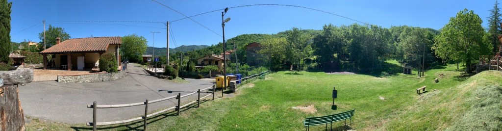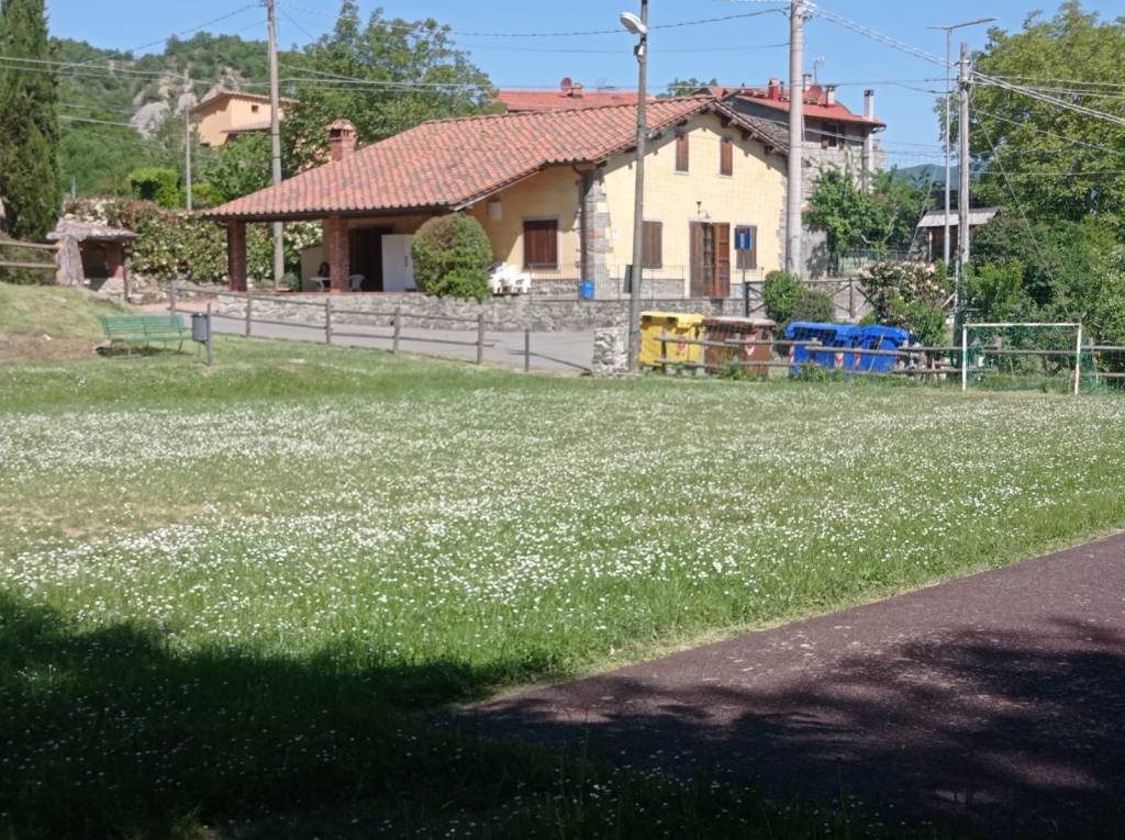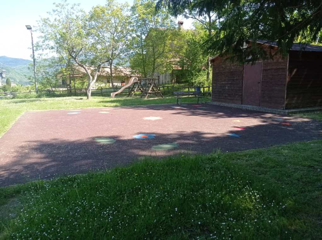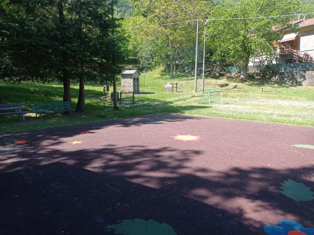 Dall’altro lato della strada (quasi non trafficata) sono presenti i giardini comunali attrezzati con giochi per bambini, porte da calcetto, fornacelle e alberi di marrone dove i bambini troveranno refrigerio e un piccolo orto.